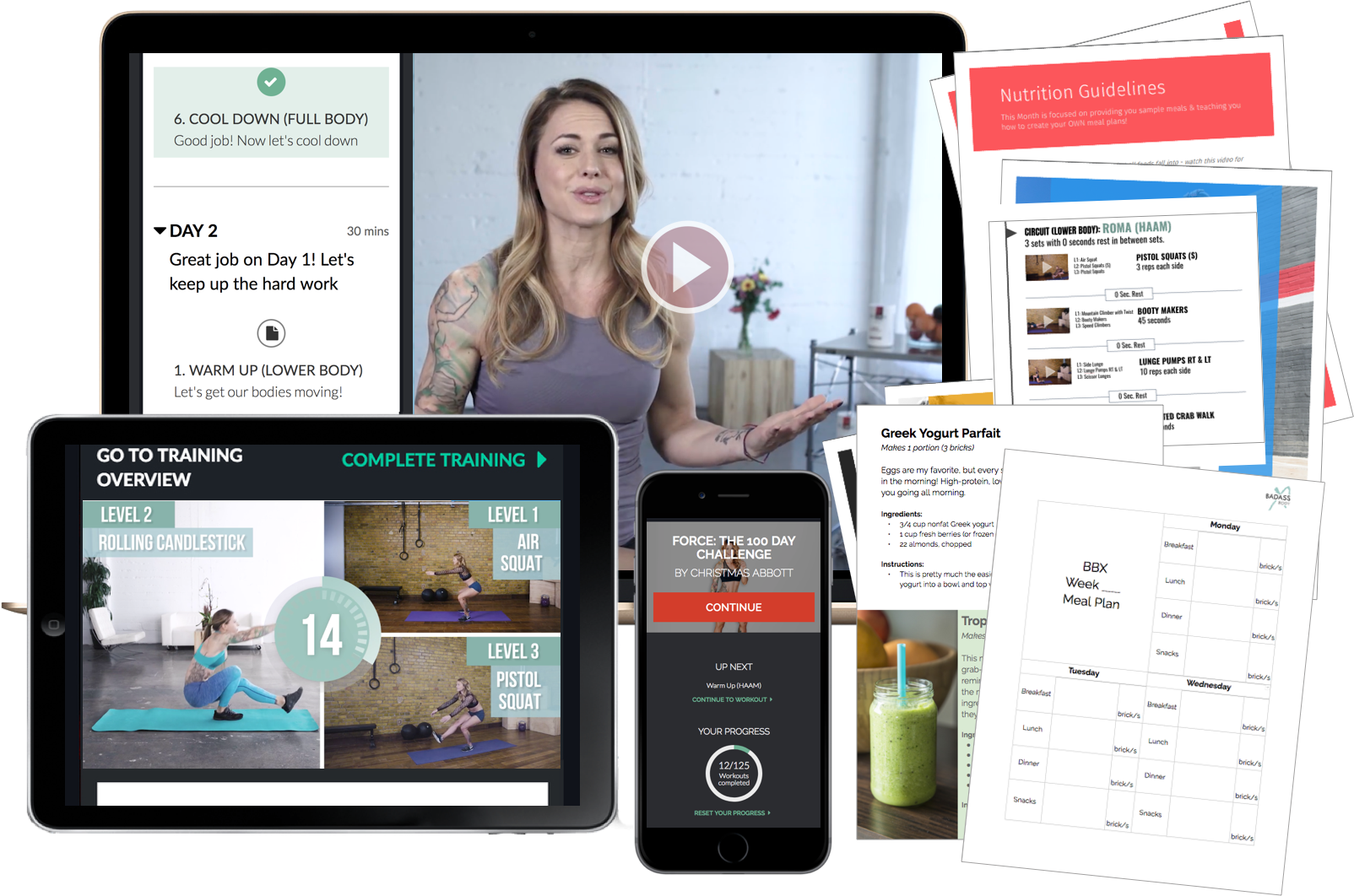 Inside the online platform, you can see your whole BBX Force workout plan. Just click on Day 1 and you'll see your first warm-up, workout and cooldown - all you need to do is click through the lessons and follow along with the videos!