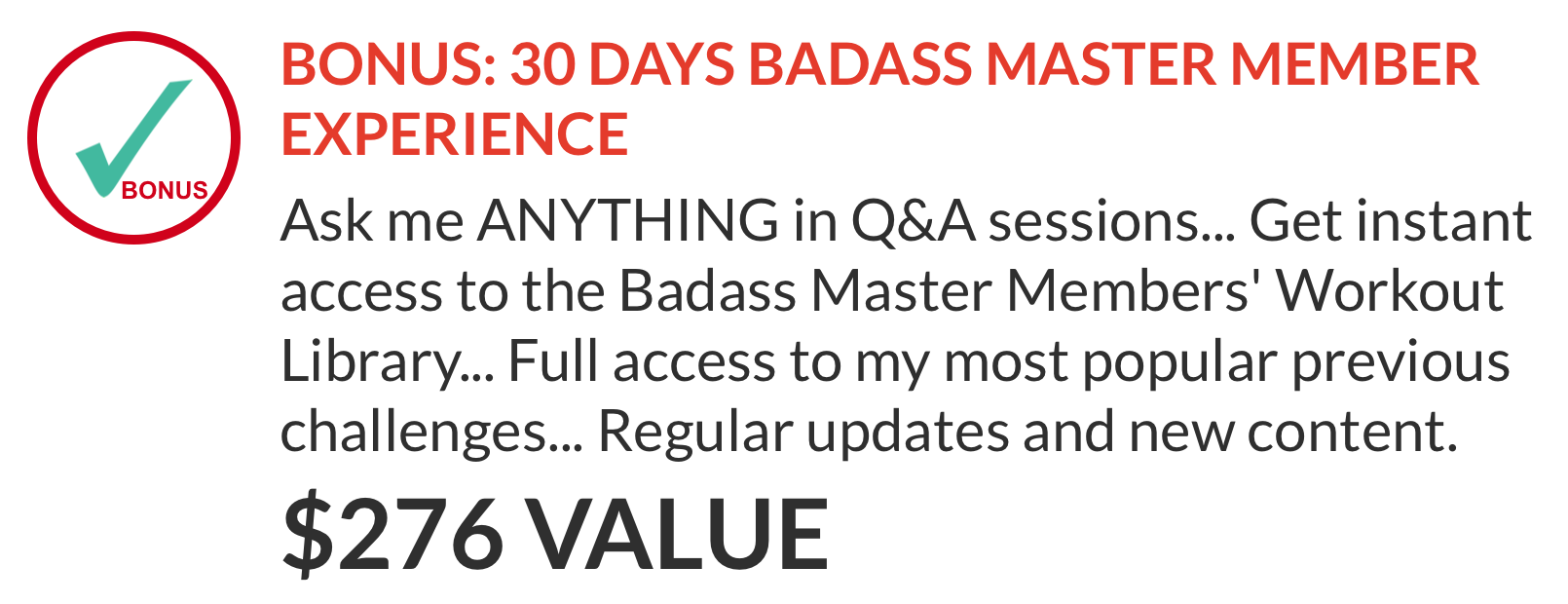 Ask me ANYTHING in Q&A sessions... Get instant access to the Badass Master Members' Workout Library... Full access to my most popular previous challenges... Regular updates and new content.
