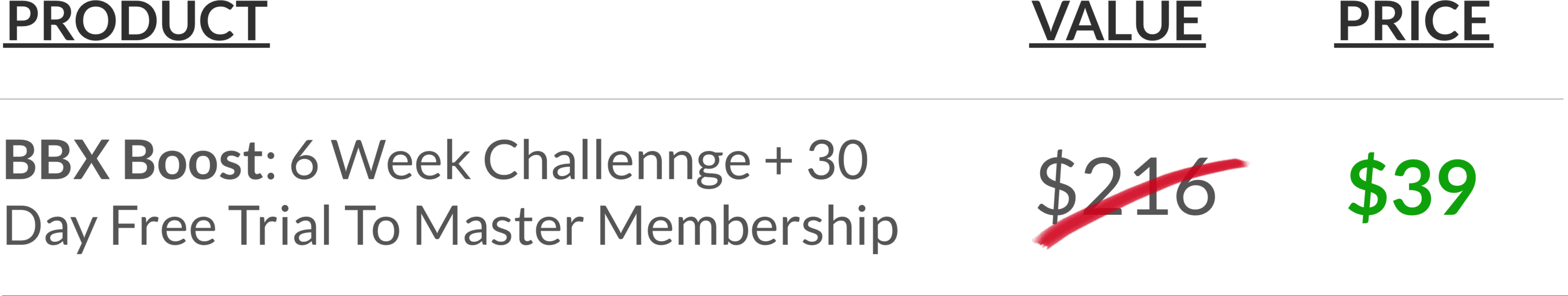 • BONUS #2: Lifetime access to the BBX Boost 6 Week Challenge and all workouts included