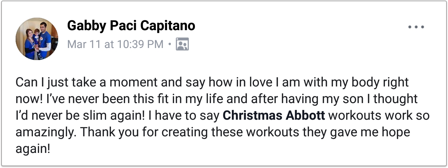 "With Christmas’s workouts & nutritional guide, I’m finally seeing some changes in those stubborn glutes & abs and gaining crazy strength everywhere!"